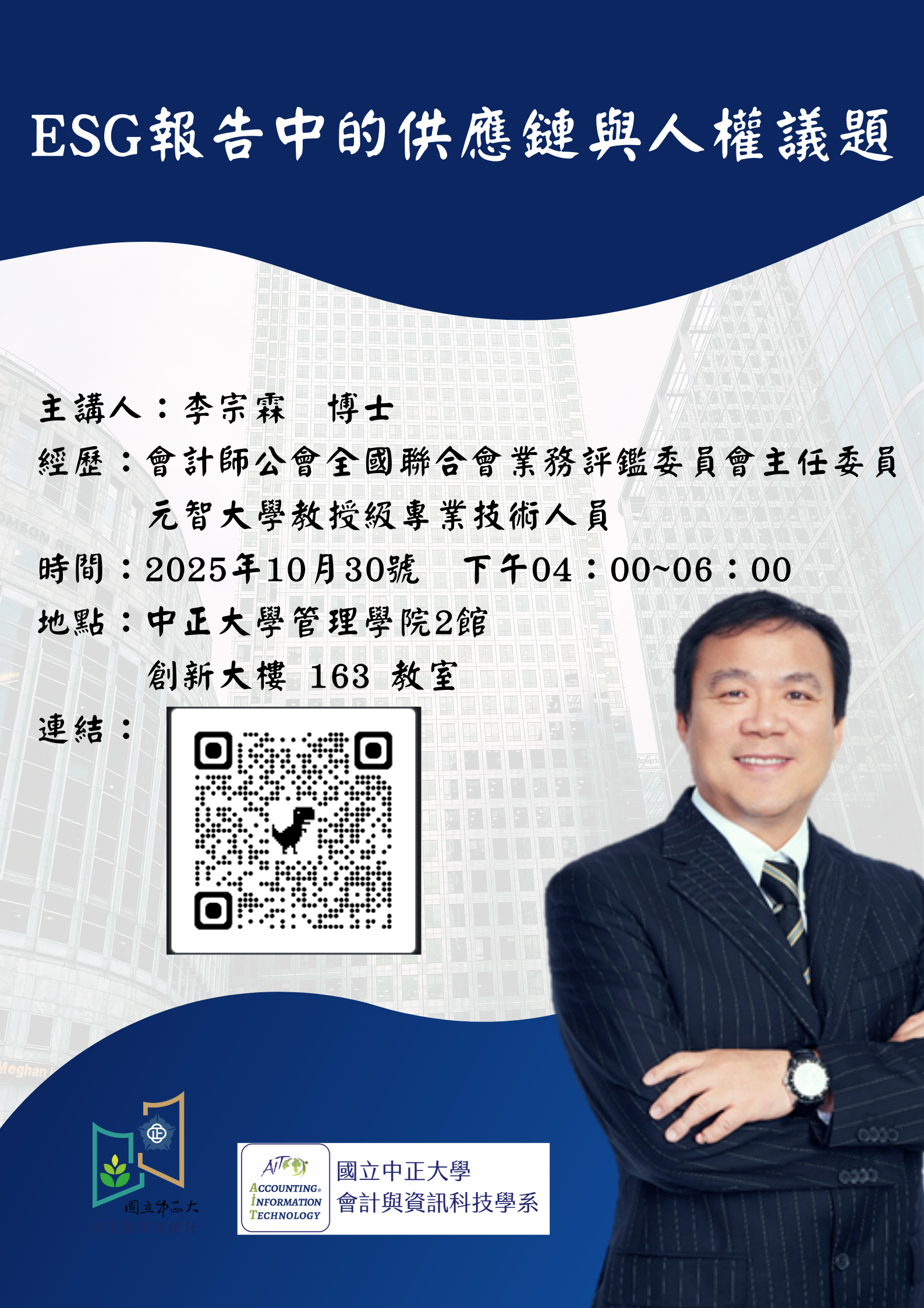 114年度高等教育深耕計畫 『3-2-5 人本永續 智慧生活』 專題演講 永續的表達與揭露於114/10/30(四)下午16:00-18:00